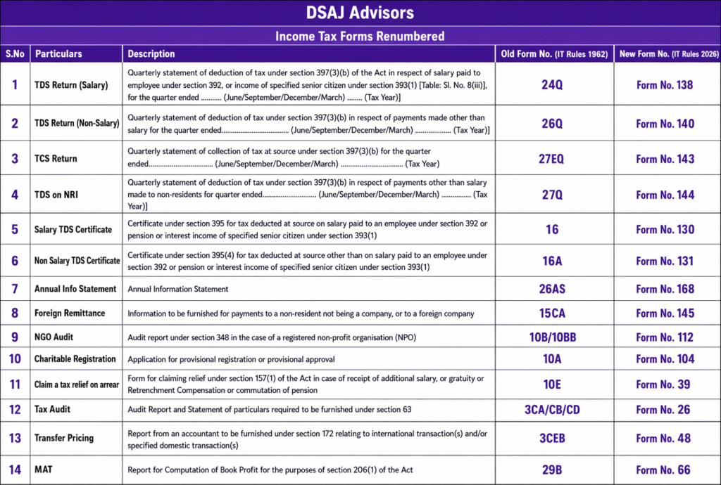 The Income Tax compliance landscape is evolving, and one of the significant recent changes is the renumbering of key Income Tax forms under the IT Rules, 2026. While the underlying compliance requirements largely remain the same, the form numbers have been rationalized and restructured to improve clarity, reduce duplication, and align with the concept of a โTax Year.โ